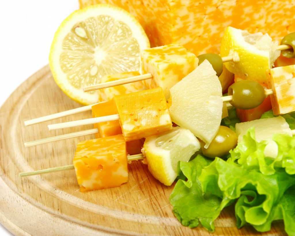 - Подготовленные продукты нанизать на шпажки в следующем порядке: виноградина, долька мандарина, кусочек груши, ломтик сыра.