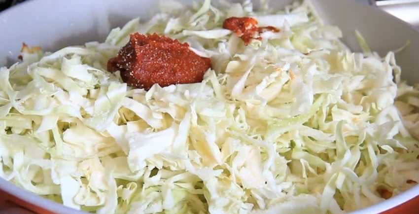3. Тонко нашинкуйте капусту и выложите ее в сковороду к пассерованным овощам, посолите. Положите томатную пасту, измельченный чеснок и зелень.