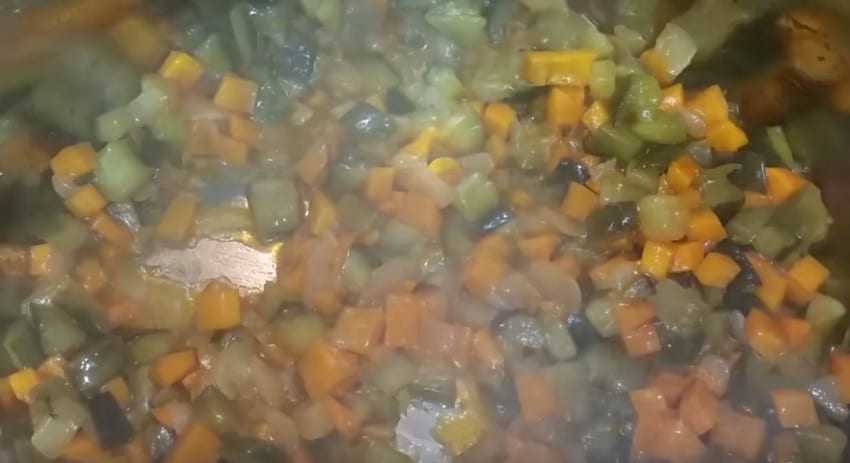- Размешиваем, вводим фильтрованную водичку и тушим солянку до мягкости овощей, накрыв крышкой сковороду.