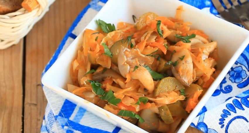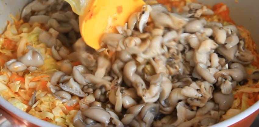 5. Нарежьте грибы крупными кусками, отправьте их к капусте. Смешайте и тушите еще 5 минут, не накрывая крышкой.