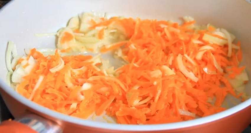 2. Разогрейте на сковороде растительное масло, обжарьте лук с морковкой 5 минут, периодически помешивая.