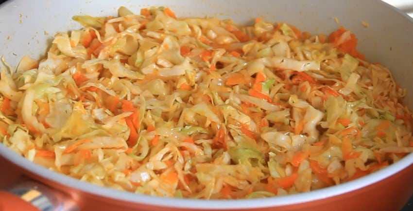 3)напоминаю, что лук предварительно не обжариваем, сразу кладем его в сыром виде к капусте – так надо, и как вы видите, никакого томата (. ),