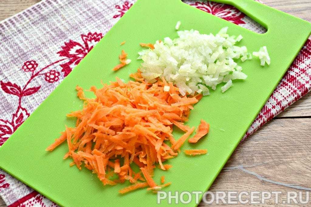 Очистите остальные овощи. Измельчите их следующим образом: морковку натрите, а репчатый лук мелко нарубите. Параллельно налейте на сковороду растительное масло и разогрейте его.