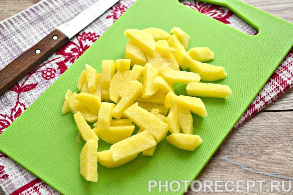 - Почистить клубни картофеля, порезать их небольшими брусками, отправить в кастрюлю.
