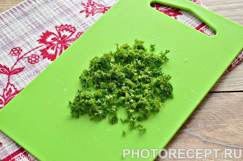 Промойте свежую петрушку (или используйте другую зелень – укроп, зеленый лук). На разделочной доске мелко нарежьте петрушку.