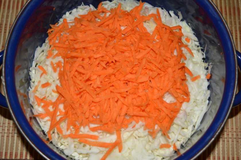 - Морковь натрите на крупной терке. Смешайте капусту с морковью.