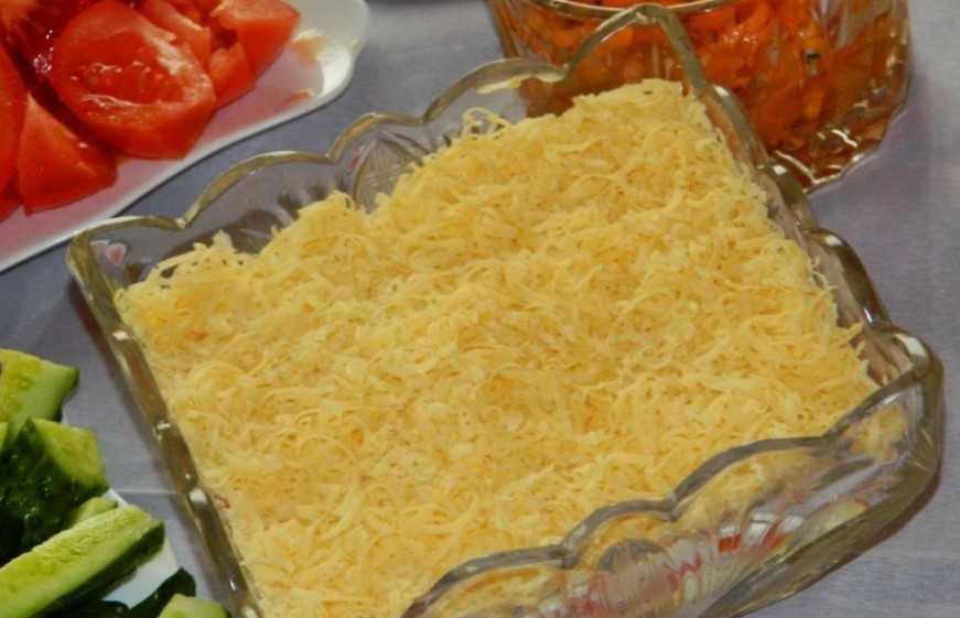 - Яйца отварить, затем остудить, почистить и натереть на терке.