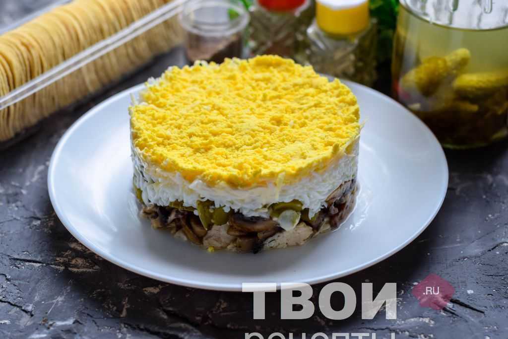 При помощи кулинарного кольца или разъемной формы собрать салат – каждый слой прослаивать майонезом, присыпать солью/перцем – курица, грибы, корнишоны, белок, сыр, желток.