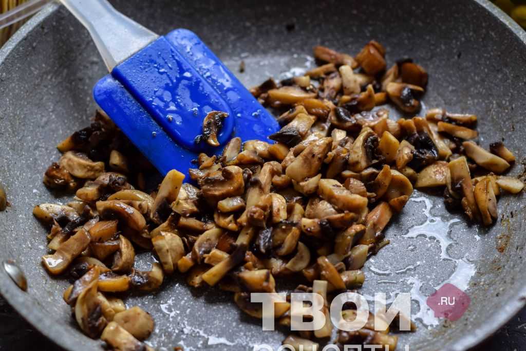 Масло растительное подогреть в сковороде, шампиньоны хорошо вымыть и очистить шляпки. Нарезать грибы полосками или кубиками. Так как салат слоеный – нарезка всех ингредиентов не должна быть крупной, это же касается и грибов. Обжарить шампиньоны до готовности, убрать на время в сторону, чтобы они остыли. Также грибы лучше переложить в сито, чтобы ушло лишнее масло, которое в салате не к чему.