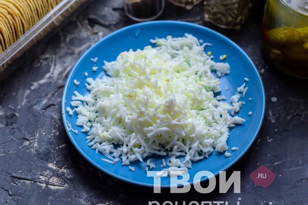 Яйца отварить привычным способом, очистить и разделить отдельно на белок и желток. Белок натереть в отдельную плошку на самой мелкой терке.