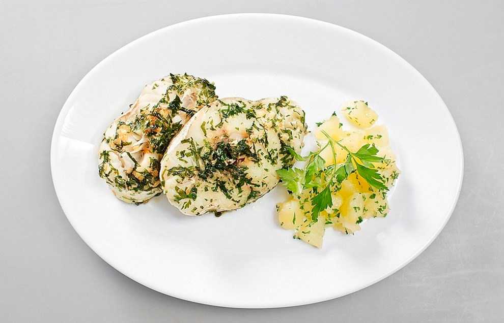 Оптимальная порция для двоих – 4 кусочка хека. Кроме рыбы, вам потребуется 2-3 зубчика чеснока, рубленая петрушка, 1 лавровый листик и оливковое масло.