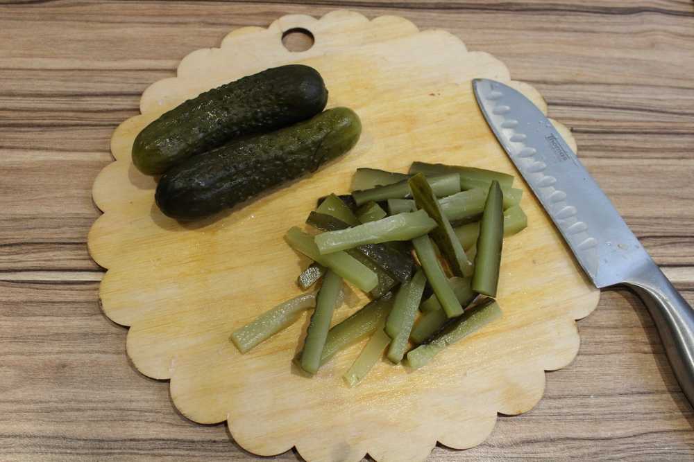 - Соломкой режут огурец, укроп мелко шинкуют ножом.