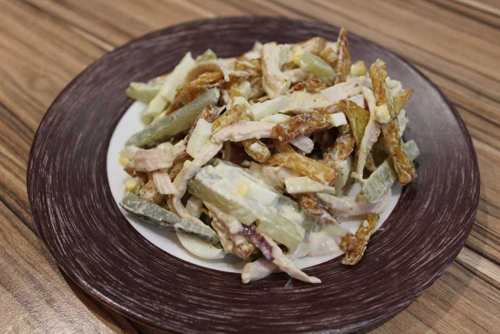 Салат с жареной картошкой соломкой и свиными ребрышками