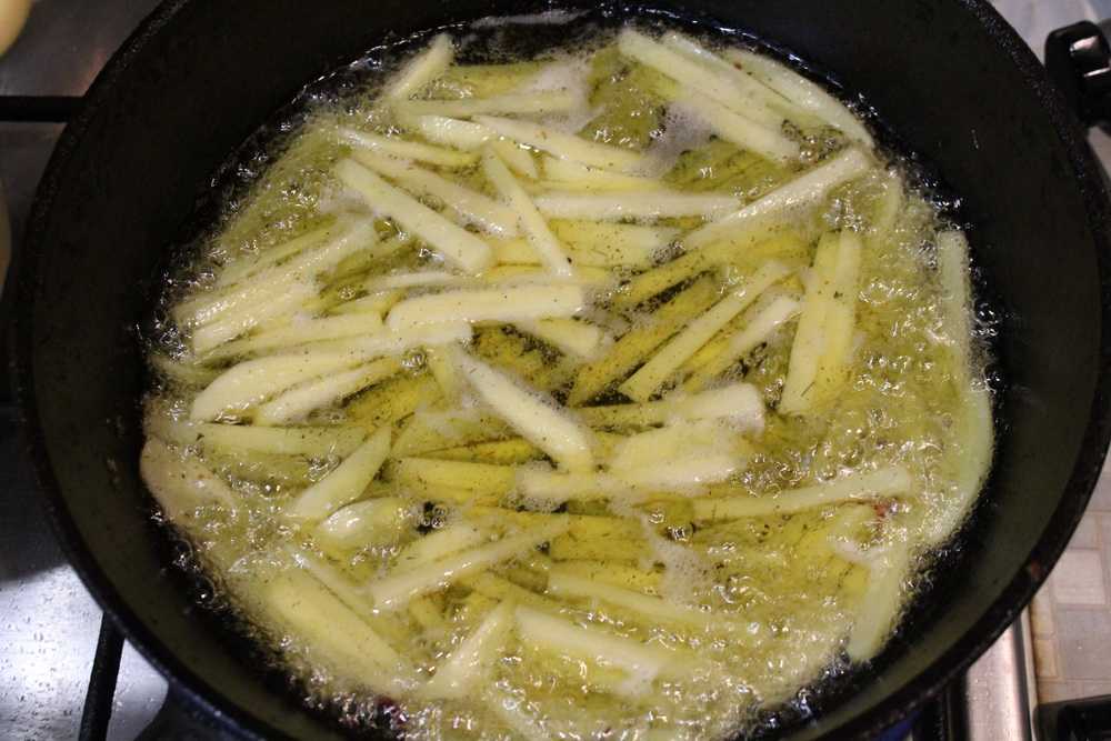 - Опускаем на несколько секунд в большое количество раскаленного растительного масла (весь картофель должен быть покрыт маслом), вынимаем, как только овощ приобретет легкий золотистый оттенок.