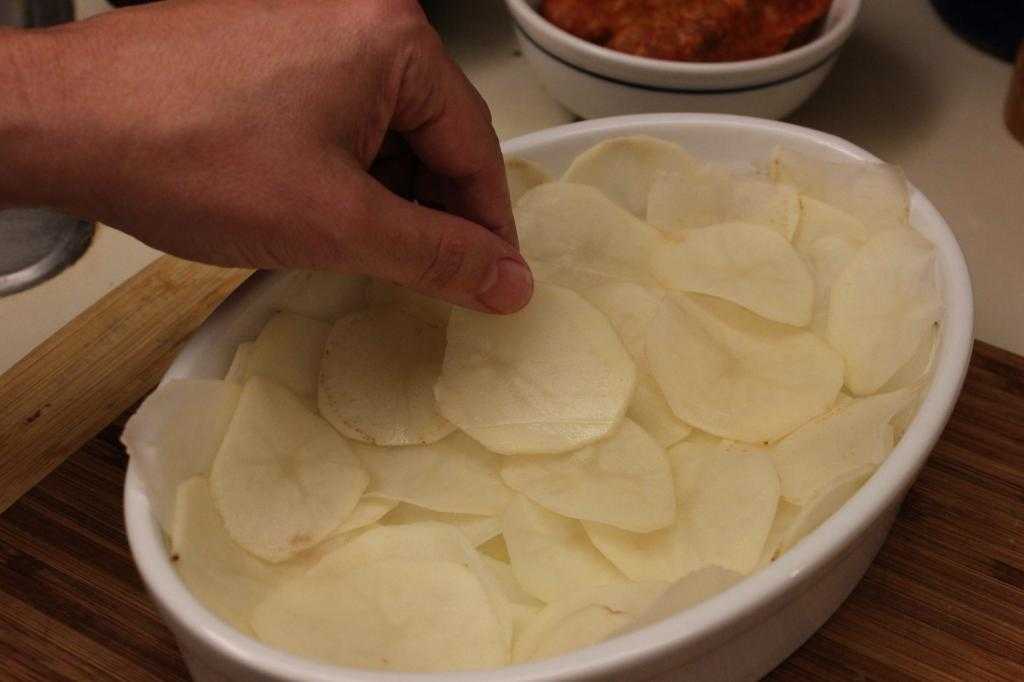Картошку очистить, нарезать тонкими кружочками и замочить в холодной воде на четверть часа.