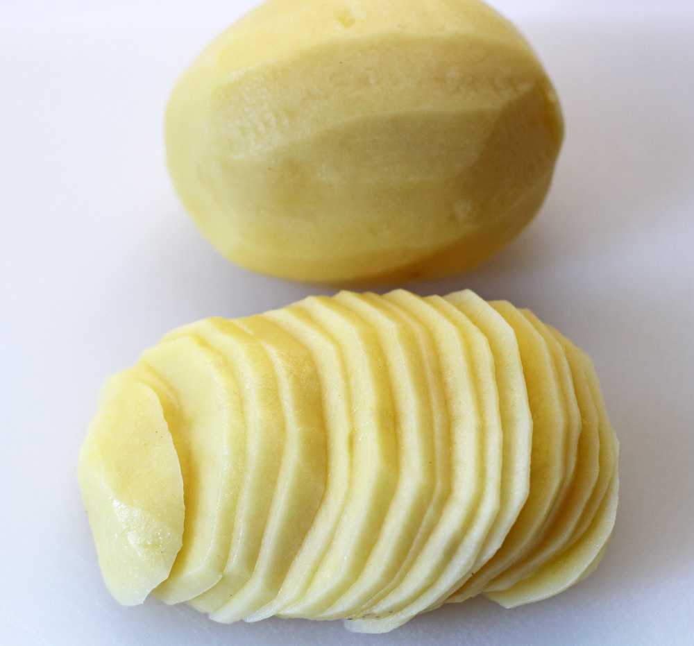 Сырой картофель очистить, порезать тонкими кружками толщиной не более сантиметра.