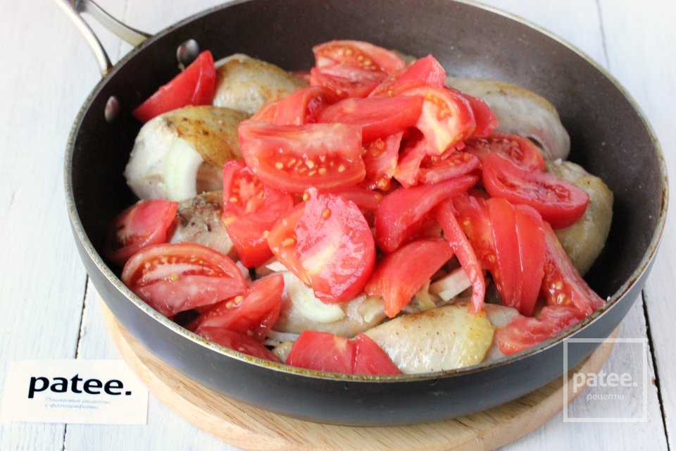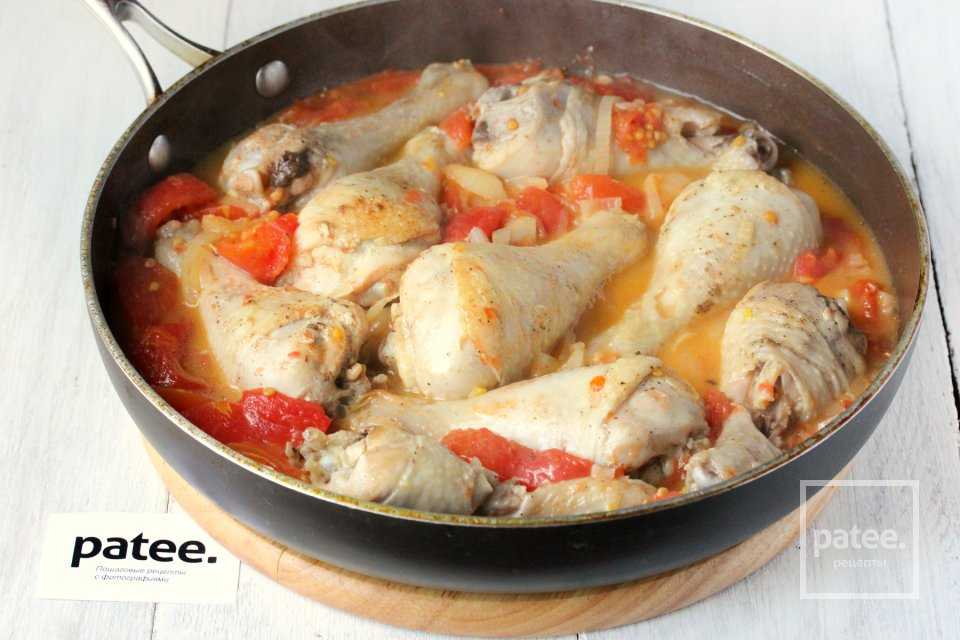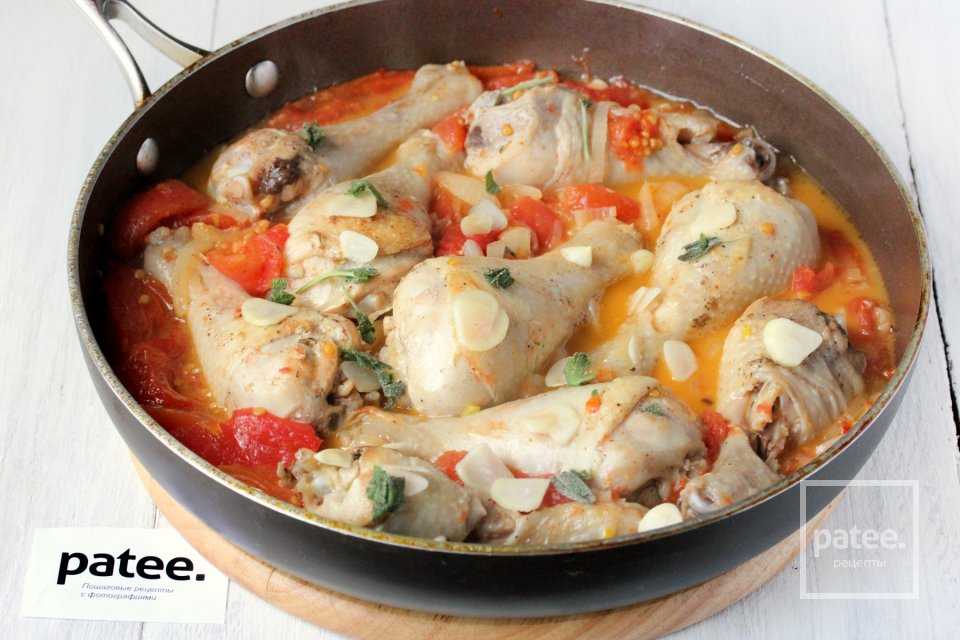 Накрываем сковороду крышкой и на среднем огне, периодически перемешивая, готовим курицу до тех пор, пока помидоры не превратятся в соус. Соус пробует на вкус и при необходимости досаливаем.