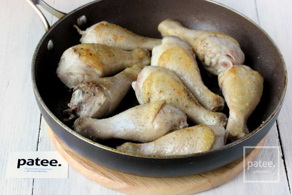 В глубокой сковороде на оливковом масле обжариваем со всех сторон до золотистого цвета куриные голени.