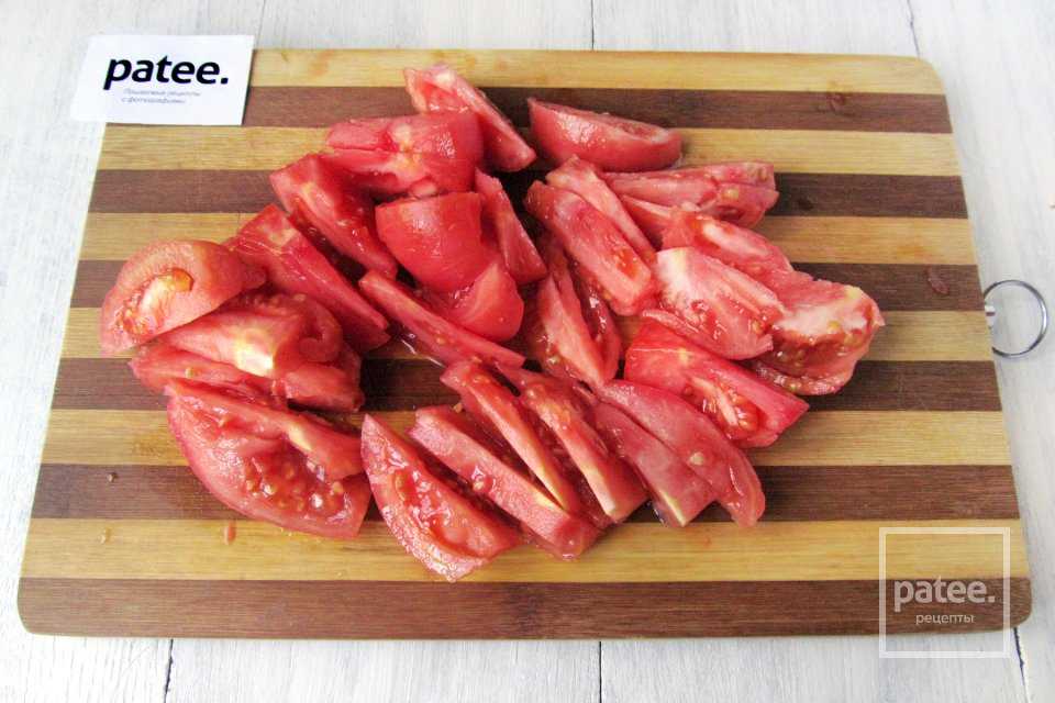 Помидоры моем, делаем на них со стороны, противоположной плодоножке, крестообразные надрезы и заливаем на 20 секунд кипятком, затем кипяток сливаем и помидоры очищаем от кожицы под струёй холодной проточной воды. Мякоть помидоров нарезаем ломтиками.