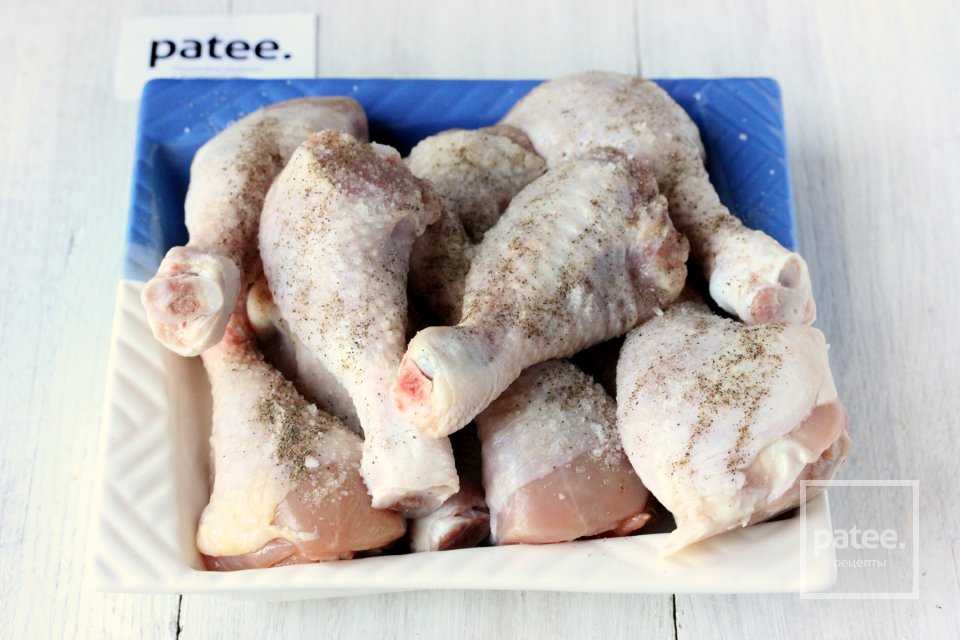 Куриные голени или другие части курицы моем, просушиваем и натираем со всех сторон смесью соли и чёрного молотого перца.